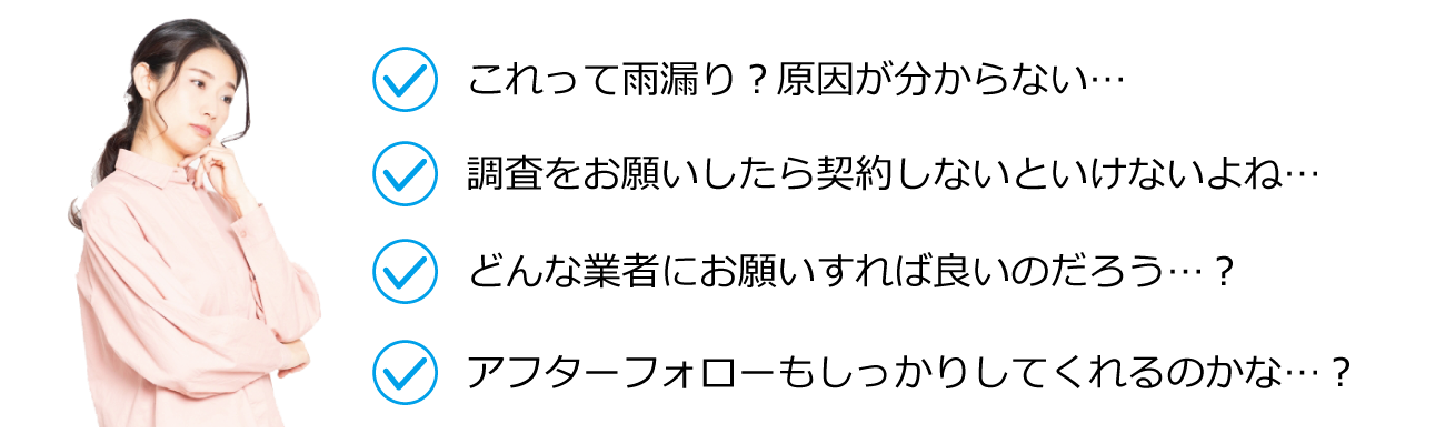 雨漏りの原因は千差万別。プロでなければわからない事がたくさんあります。雨漏りを見つけたら、すぐに専門家に見てもらう事をおすすめします。