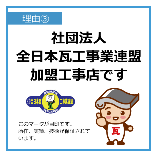 ○「社団法人全日本瓦工事業連盟」に加盟している業者かどうか。